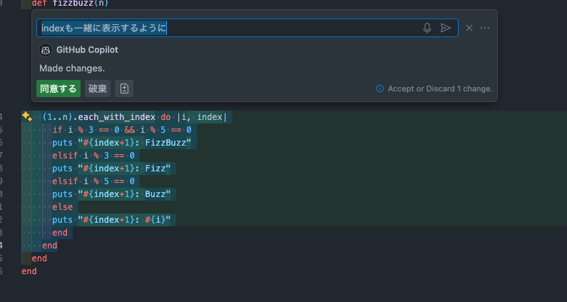 あとは、コードを選択してまたキラキラマーク押して、指示すると選択箇所をいい感じ修正とかもしてくれる。